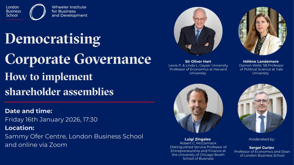 Moderated by Professor Sergei Guriev, Professor of Economics and Dean of London Business School, the discussion will introduce a bold proposal to democratise corporate governance by empowering mutual fund investors through shareholder assemblies, an idea inspired by the citizens’ assemblies reshaping democratic participation around the world.