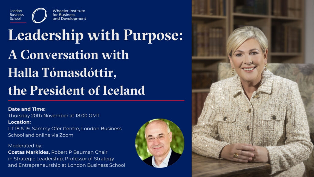 The Wheeler Institute for Business and Development at London Business School is delighted to welcome Halla Tómasdóttir, President of Iceland, to London Business School for a conversation on what it means to lead in a moment of global transformation.