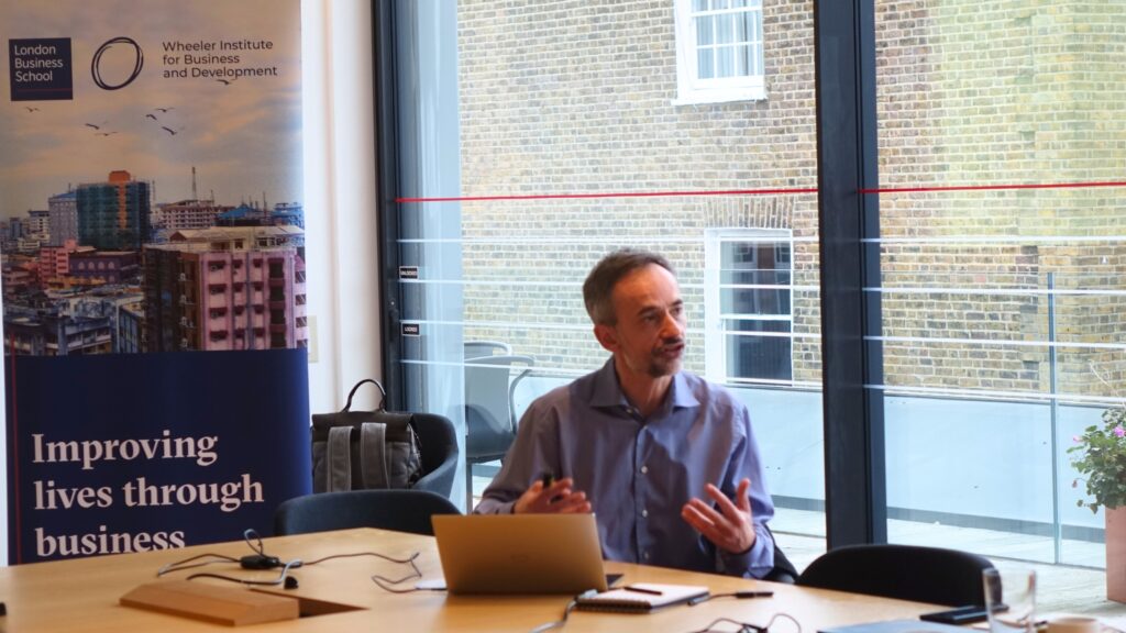 The session opened with a short overview of the Wheeler Institute from Tiago Martinho, Executive Director of the Wheeler Institute for Business and Development. This was followed by a presentation from Gaurav Mehta (founder of Dharma Life and LBS alumni) and Rajesh Chandy, Professor of Marketing, Tony and Maureen Wheeler Chair in Entrepreneurship and Co-Academic Director of the Wheeler Institute. Gaurav and Rajesh, introduced the work of DL Labs and highlighted three studies exploring credit and care innovations aimed at advancing women’s economic empowerment, supported by the Gates Foundation. Diva Dhar and Sumana Hussain then shared insights from the Foundation’s objectives and work of the Women’s Economic Empowerment division. The meeting proceeded with Aneeta Rattan, Professor of Organizational Behavior at LBS, who presented an overview of her current research on Boosting Inclusion in Entrepreneurship and in STEM pathways and Jérémie Gallien, Professor of Management Science and Operations at LBS, who presented his current research on maternal health operations.